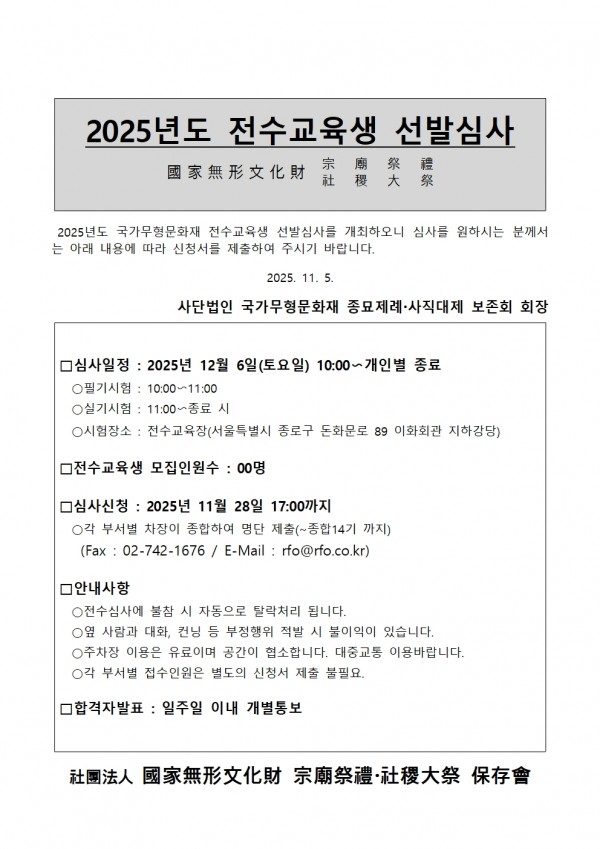 2025년도 전수교육생 선발심사